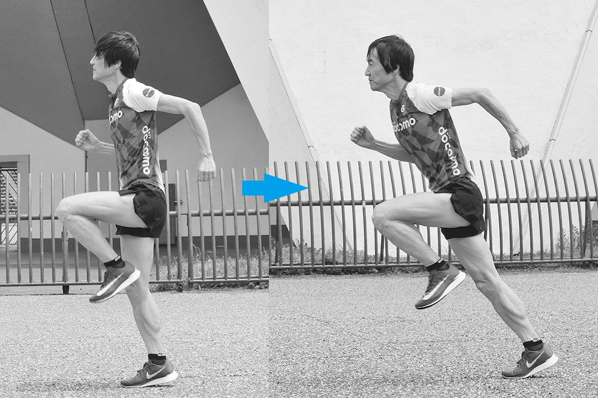 体幹と地面を捉える力を意識しながら、その場でモモ上げ。すると、自然と腰高フォームが意識できる。上体が前傾しすぎたり後傾しすぎたりしないよう注意しながら全身を使って行おう。