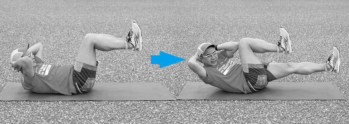2.上半身を軽く持ち上げ、左ヒジと右ヒザをタッチ