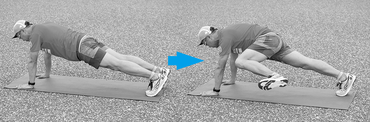 腹横筋と腹斜筋を鍛えるスパイダープランク(左右10回)