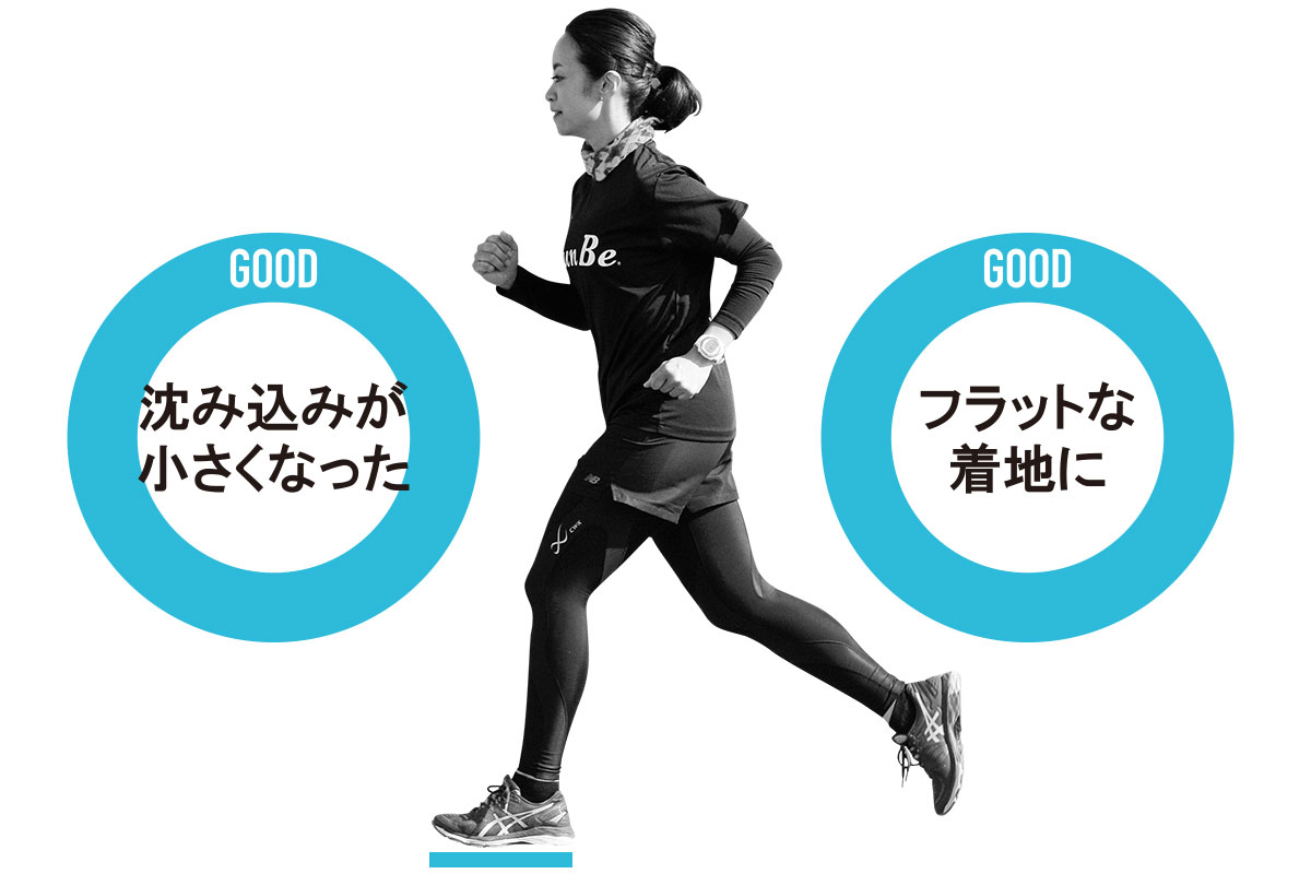 体幹を意識するだけで、沈み込みの少ないスムースな走りに変わりました! 修正前に比べ、きれいな前傾姿勢がとれていますね。また、カカト着地を改善したことにより、脚の回転も非常になめらかに。スピード感のあるフォームです。このフォームが定着すれば、故障も未然に防げるでしょう。