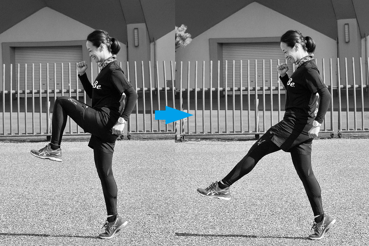引き上げた脚を大きく前に出してから、体の真下で着地する。このとき、カカトからではなくつま先から着地することがポイント。