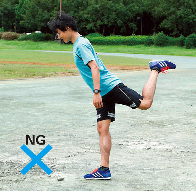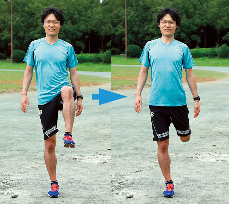 脚の引き上げ動作により、ダイナミックな脚運びを身につけるドリル。片脚でバランスを取りながら、脚を前後に大きく動かす。脚を上げたら、うしろへ引く動きを繰り返すことで、太モモの付け根の腸腰筋を意識でき、ヒザを高く引き上げることができる。さらに、上体が左右にブレないように体幹を意識。左右10〜15回ずつ行う。