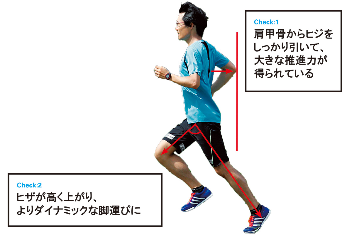 体幹で支え、左右バランスが取れたフォームへと変化しています。ヒジをしっかりとうしろまで引けているので、上体で推進力を生み出せるようになりました。また、蹴り出しの際に、腸腰筋から動かす意識をおて、ヒザが高く上がりダイナミックな脚の軌道を描けるように変わっています。これまでよりも、フォームにスピード感がついています。