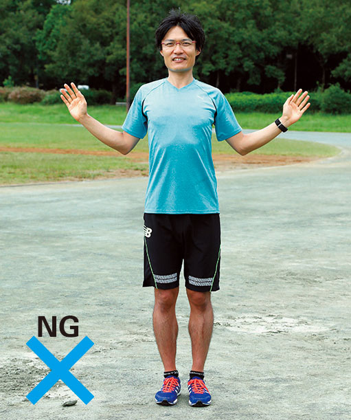 肩甲骨まわりの筋肉の柔軟性を高めることで、腕振りの可動域を広げるエクササイズ。まず、ヒジとヒジを合わせた状態から始め、肩甲骨の根元から動かすイメージで、肩を広げていく。腰をそらさず、へそを凹める意識をもつことが大切。走り出す前に、5〜10回を目安に行う。