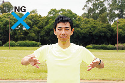 腕を上からしっかり下げていき、次に、腕を前方へ伸ばしてからヒジを後ろへ引くようにして、肩甲骨まわりの柔軟性を高めていく。腰を反らさずへそを凹ませて体幹を安定させることがポイント。毎日走り出す前に10回ほど繰り返すとよい。