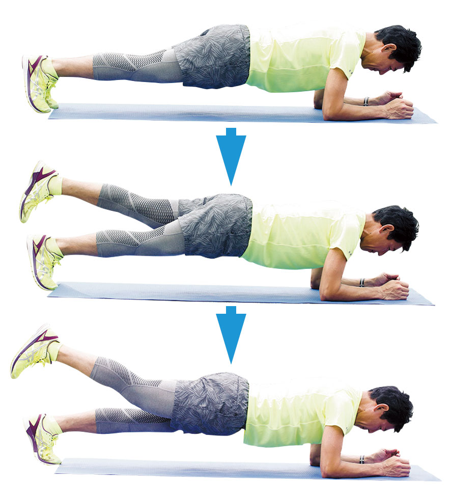 ヒジと足先をつけたリラックスした状態から、腰を引き上げる。まずは体幹がフラットな姿勢で10秒キープ。その後、5秒おきに片脚ずつ入れ替える。最後に両足先を着け、体幹で支えた状態で、10秒キープする。トータル30秒の体幹エクササイズ。