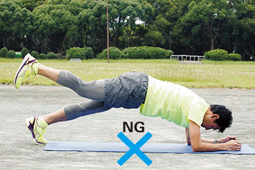腕に荷重がのりすぎ、体幹が抜けてしまうと効果はない。へそをグッと締めて、体幹で姿勢をキープする。
