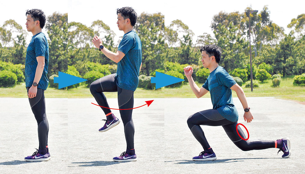 でん部を効果的に使えるようになるドリル。前方へ脚を出すランジとは異なり、後ろ側へ脚を出す。直立状態で、太モモの付け根から上へ引き上げたら、尻やハムストリングスを使って脚を後方へ着地させる動きを左右10回ずつ。このとき、姿勢をフラフラさせず、体幹で安定させることがポイント。