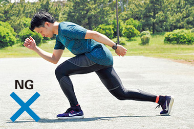 脚を後ろに下げたときに、骨盤が前傾しないように注意したい。上体はまっすぐ前を向いた状態をキープ。