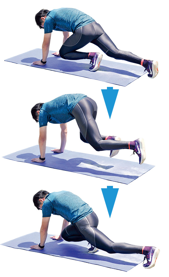 でん筋やハムストリングスをはじめ、体幹全体を鍛えることができる。両手をついた状態から、その場でトントントンとリズムよく片脚ずつ入れ替える。前方へ脚を引き上げる意識をもち、後方に着いた脚はしっかりと伸ばして着地すると、後ろ側の筋肉に刺激が入る。