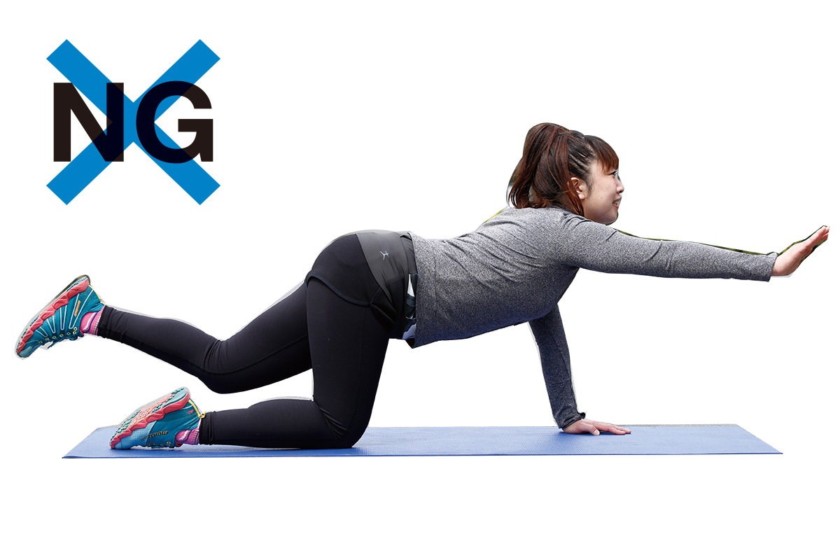 腰が反らないように注意。腕も足も曲がらずにまっすぐ水平になっていることを意識する。