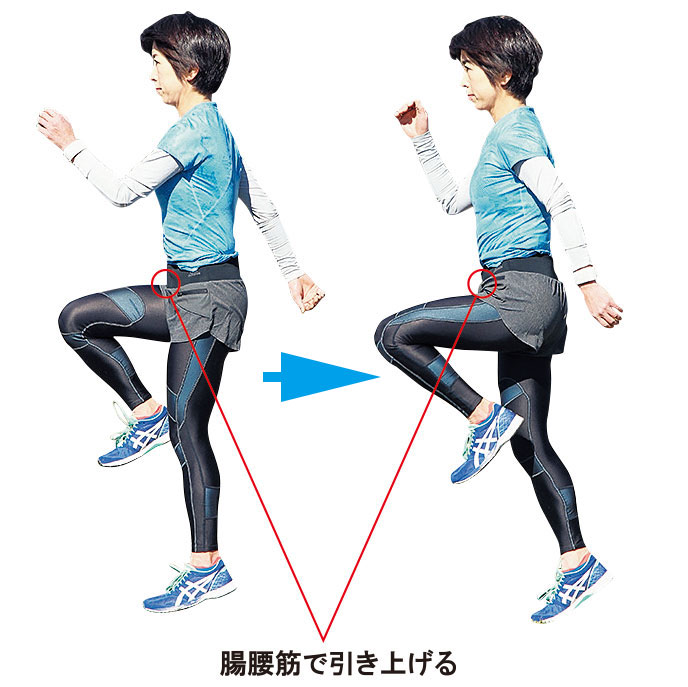 着地時にブレーキをかけず、重心位置に乗ったスムースな足の動きを習得するエクササイズ。その場でリズミカルに「モモ上げ」を繰り返し、その流れで前方へ走り抜ける。太モモも高く上げることで、しっかりと足を上から下ろすことができ、フラットに近い着地がしやすくなる。