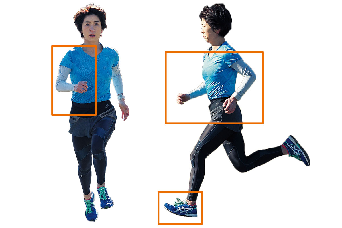 ダイナミックなフォームですが、腕振りと足の動きの連動が取れておらず、全体的にバタついた印象になっています。足は太モモの付け根にある腸腰筋を意識して、しっかり持ち上げる意識をもつことが大切です。カカトで着地気味なので、フラットに着地できるように改善しましょう。