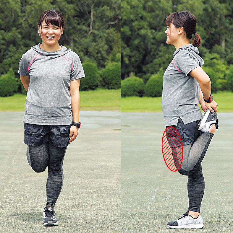 ビギナーに多いヒザの痛みは、前もも(大腿四頭筋)の緊張が原因になりやすい。練習の前後に、片足を抱えて前ももを伸ばすストレッチを取り入れる。しっかり引きつけることで、股関節の付根の腸腰筋のストレッチ効果も生まれる。