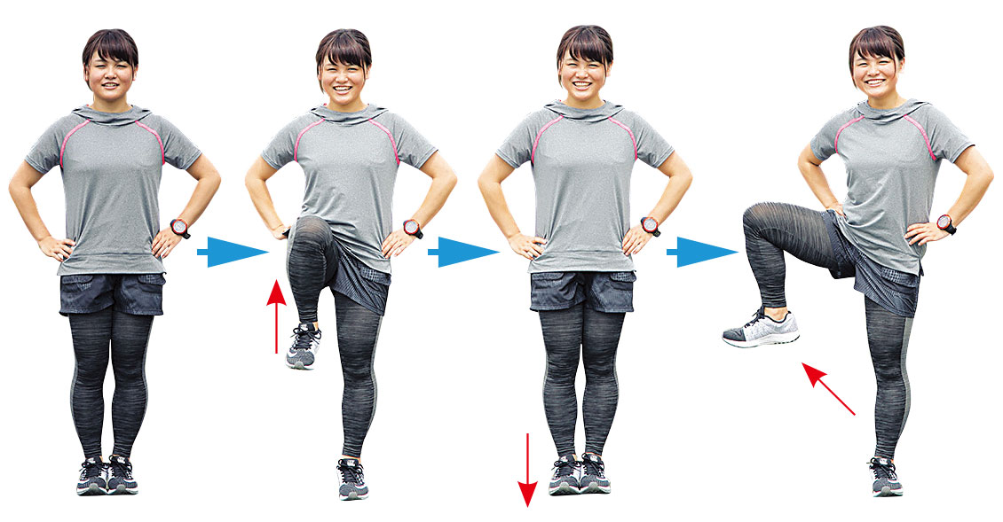 まず片足を正面に持ち上げて下げる。次に横に持ち上げて下げる。これリズミカルに5〜10回繰り返す。体を支えるため、体幹の強化にもつながり、はじめは負荷も高いので1回1回丁寧に3回を目標に確実に行なう。また、足の外側に重心が乗らないように、足裏をしっかり地面に付ける意識で行なう。