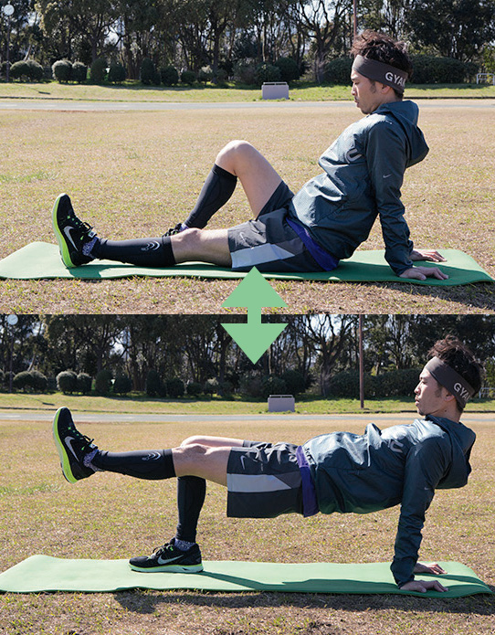 床に脚を伸ばして座り、両手で上半身を支える。片脚のヒザを立て、足裏を地面に付けた状態で、お尻を上下させるエクササイズ。
