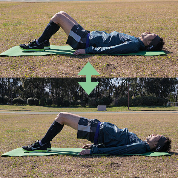 仰向けの状態で腹筋に力を入れ、腰を反らないように注意しながら、お尻を持ち上げては下げるヒップアップ。脚をそろえてお尻を上げ下げすればラクに行える。強度を上げたい場合にはつま先をあげて行うとよい。