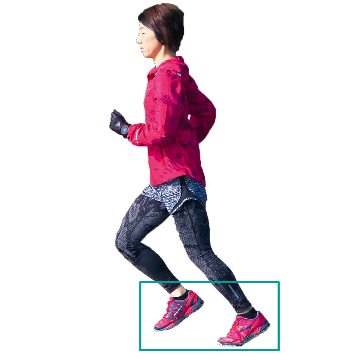 でん筋、ハムストリングスなど、後ろ側の筋肉が使えていないため、推進力が生まれにくい状態。ヒザ下の動きに頼りきった走りです。