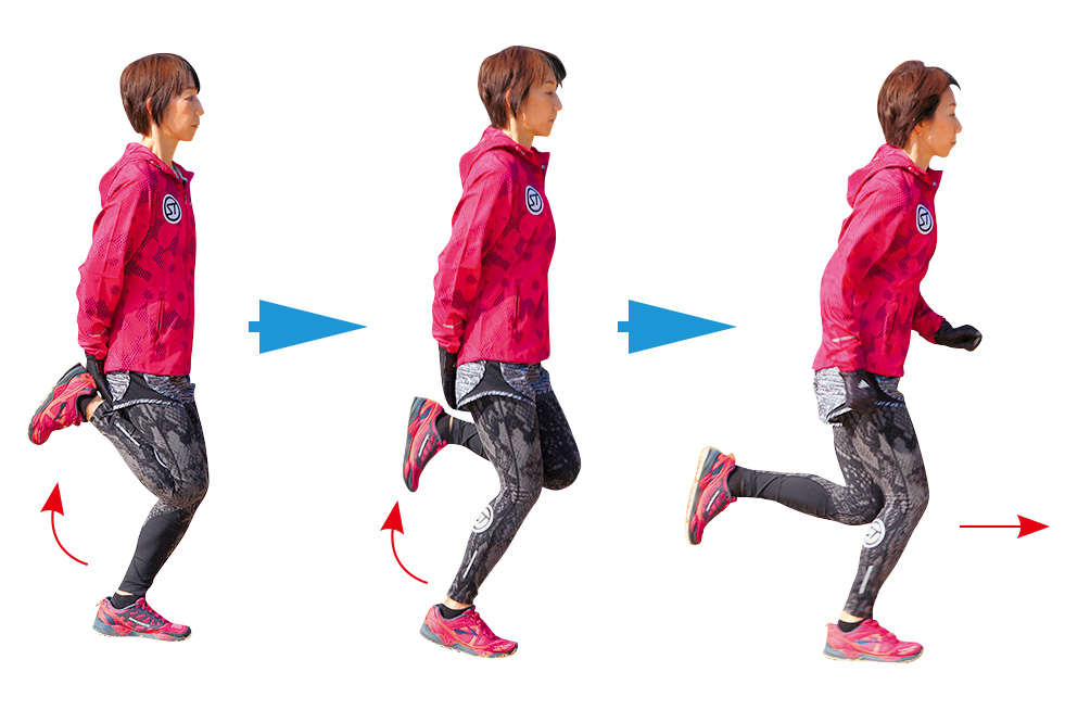 少し前傾姿勢を意識し、なるべく早いリズムで足をお尻に付けるように、後ろに蹴り上げる。10回蹴り上げたら走りだす。このエクササイズで蹴り上げる力が身につき、推進力が生まれる。ウォーミングアップで、毎回行うと次第に変化が表れる。