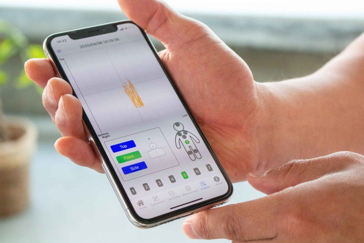 CAT-b.c.s.は、計測する「MS」、振動刺激する「FS」、そしてスマホアプリの3つで機能するシステム。測定用装置「MS」は付属のベルトなどを使い、測定したい体の位置に固定。測定をスタートすると、体の動きにあわせて上下、縦横、左右のグラフで動きを表示。それにより自分の動きを客観的に知ることができる。