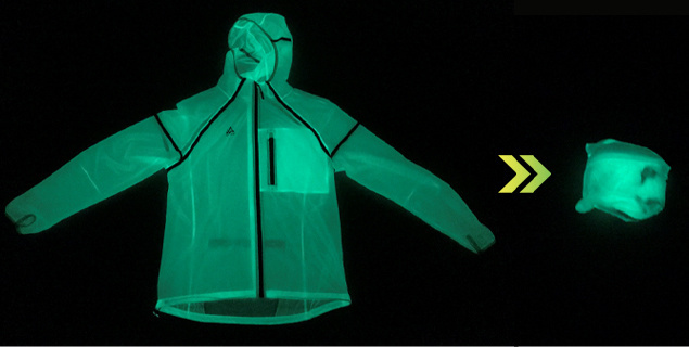 このホタルジャケットは、フランスの“Verjari”が開発した自ら蓄光・発光するというユニークなジャケット。特殊な素材を使用しているため、太陽、スマホ、ランタン、車のヘッドライトなど光源は何でもOK。単純な反射と異なり、事前に蓄光しておくことで外からの光がなくても自ら発光するというしくみだ。