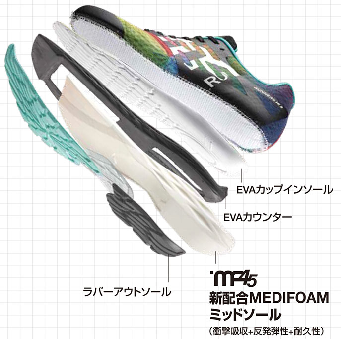 また、衝撃吸収性、反発弾性はそのままに、ミッドソールを柔らかくし、ラスト(木型)も前足部をややワイドにアレンジしてランナーフレンドリーな仕上がりに。通気性に優れており、シームレスのため足入れ感もアップ。「MEDIFOAM」の特長のひとつでもあるデザイン性の高いアッパー(甲)も健在、ランナーのモチベーションアップをサポートしてくれる。
