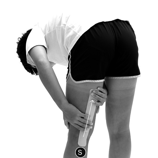 ヒザを曲げず前屈した状態でハムを伸ばす。ヒザの裏を始点にテープを貼り、上に向かって伸ばさずに貼りつける。