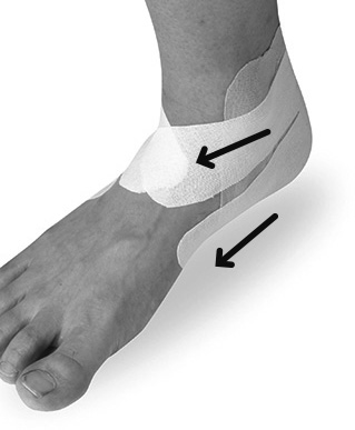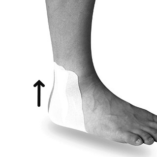 テープの真ん中にカカトを置き、くるぶしに向かって上へテープを貼りつける。これにより、走行中の横ブレを防ぎながらも蹴る動作を確保できる。またアーチアップ効果でパフォーマンスもアップ!