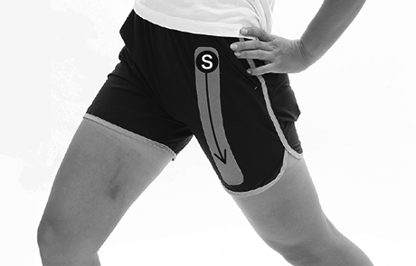 もう一つの対策は、脚の付け根のストレッチとテーピング。下の写真のような体勢で股関節を伸ばすと、痛みを未然に防げるはずです!