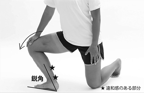 テープを貼るほうの脚を前に出し、もう片脚のヒザを立て、体勢を安定させる。このとき、前の脚の側面が胸と平行になるようにし、ヒザを前方に傾けることで、アキレス腱がしっかり伸ばされる。