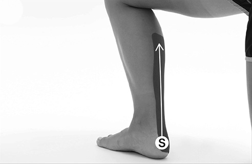 アキレス腱とふくらはぎの筋肉を伸ばした状態で、カカトからテープの端を貼り付けていく。そのまま、ふくらはぎの中心ラインに沿ってテープのテンションをかけずに、まっすぐ上に向かって貼り付けたら完成!
