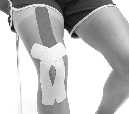 イスなどに座り、ヒザを曲げ前モモの筋肉を伸ばす。ヒザの皿上あたりからテープを上方向へと貼り付けていく。