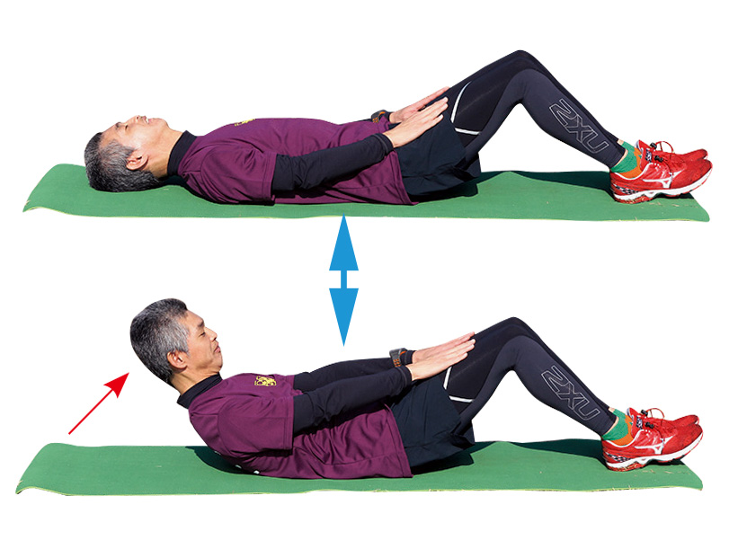 ヒザを立てて仰向けに寝て、手のひらは太モモに軽く乗せます。頭から丸めていくイメージで上体を起こし、元の姿勢に戻します。3秒かけてゆっくりと、5セット。あわせて、脚を上げながら仰向けに寝て、上体を起こすV字腹筋を、5〜10回くらい丁寧に行うと効果的です。仰向けに寝て、脚を持ち上げ左右交互にクロスする動きも10回を目安に行うとさらに効果的。