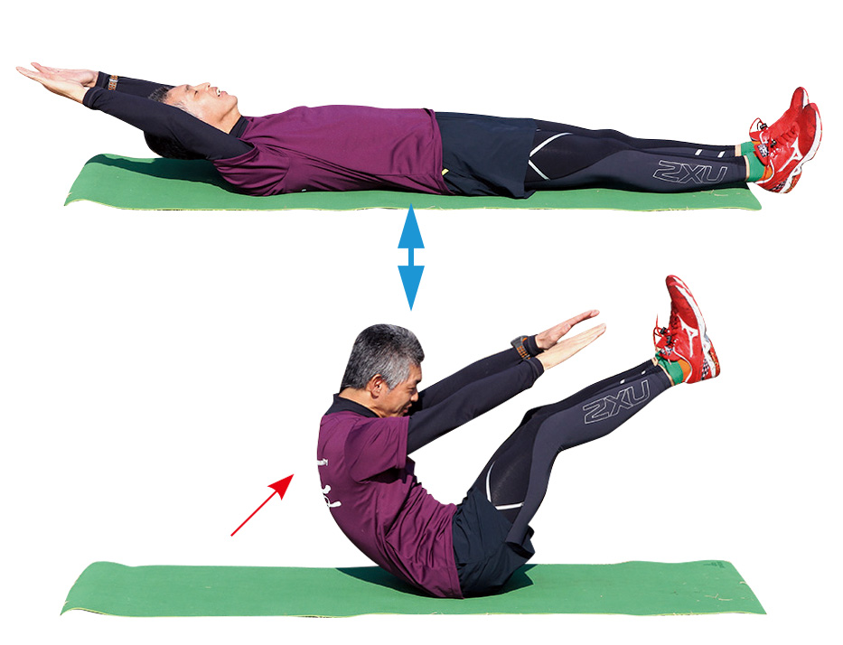 あわせて、脚を上げながら仰向けに寝て、上体を起こすV字腹筋を、5〜10回くらい丁寧に行うと効果的です。仰向けに寝て、脚を持ち上げ左右交互にクロスする動きも10回を目安に行うとさらに効果的。