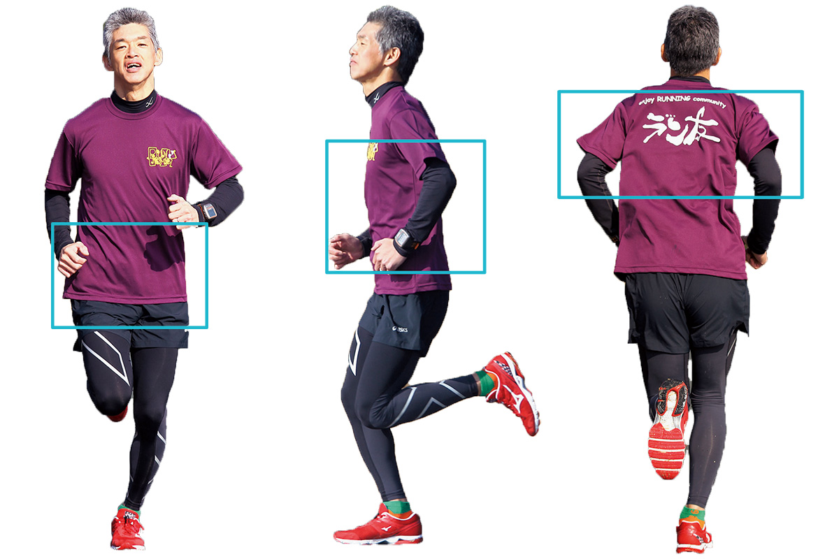 目下の目標はサブ4達成というランニング歴6年の吉田さん。しっかり胸を張っていますが、やや上半身が地面に対して垂直になりすぎています。足が前に出やすい適度な前傾姿勢に修正して、スピードアップを目指しましょう。