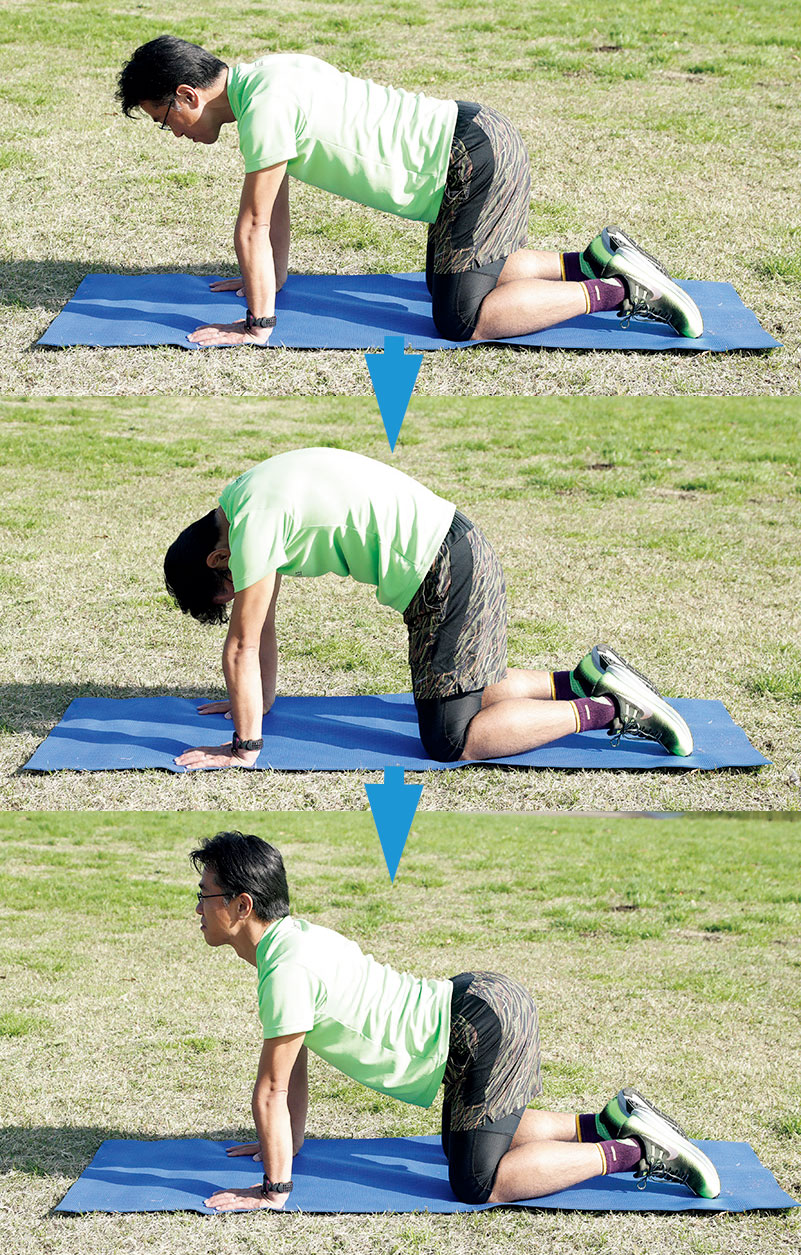 まず、両手と両ヒザをついた状態で、腹に力を入れて背中を一直線にキープします。そして、背中の丸みをつくるように引き上げたら、次にヘソを下へ突き出す動きを10〜20回繰り返しましょう。呼吸は、背中を丸めながら吐き、反りながら吸います。
