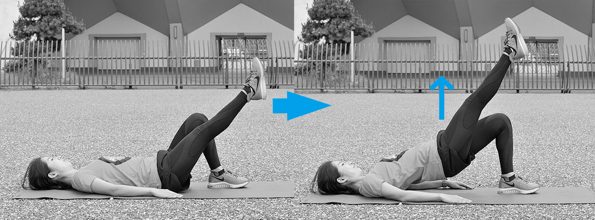 まず仰向けに寝て、両ヒザを立てます。そこから片ヒザを45度の高さまで上げていきます。このとき、床を押さえたりせずに、股関節から徐々に脚を上げていくことがポイント。そして体幹とでん筋を意識しながら体をゆっくり持ち上げ、ゆっくり下ろします。体幹を意識し、息を止めないこと。