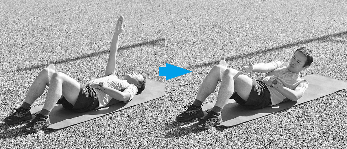 まず、太モモでボトルやタオルなどを挟み、片腕を真上に上げます。もう片手は腹筋に添えると、筋肉に力が入っているかどうか確かめやすくなります。勢いはつけずに上体をゆっくりと起こし、上げた腕を対角線上に下ろします。このとき、つま先が浮かないように内転筋を効かせることがポイント。
