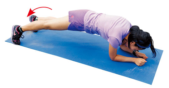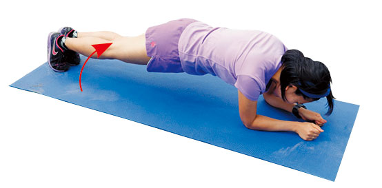 足先と腕で体幹を支えるプランク姿勢から、脚を動かしながら筋力強化をはかるエクササイズ。腹と尻を固めた安定状態を意識しながら、脚を開いて、開いて、閉じて、閉じての動作をリズミカルに繰り返します。余裕が出てきたら、足さばきのテンポを速めて1セットを15回ほどやってみましょう。