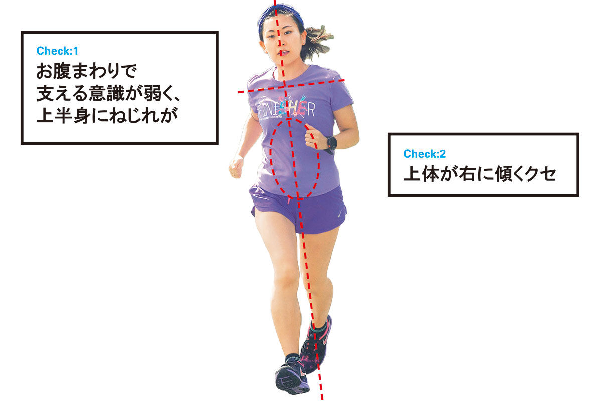 石橋さんはランニング歴5年。トレーニングを重ね、大会にも積極的に参加しています。真鍋コーチのチェックでは、足運びには問題がないものの上半身の体幹への意識が弱く、上半身に大きくねじれが起きているとのこと。これが解消できれば、お悩みの右ヒザ痛も改善していく可能性大です!