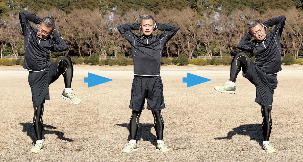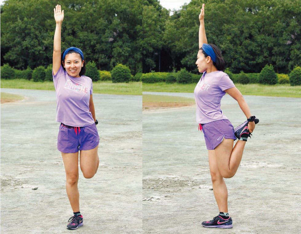 左右のフォームのバランスが崩れると、片側のヒザに負担がかかりやすくなります。そのヒザ痛の原因のひとつが、大腿(前モモ)の硬直。骨盤の付け根からしっかりとストレッチすることでヒザ痛の予防に効果です。ヒザを曲げた状態で10秒キープし、さらにうしろへ引っ張りあげて5秒。まっすぐに腕を伸ばした状態でバランスをとることで体幹も強化できます。