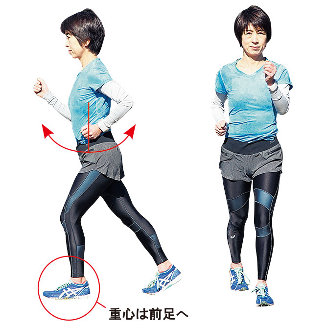 腕振りを改善するエクササイズ。ワキを締めて、ひじは90度ほどを目安に曲げます。この状態をキープして、ヒジを意識しながら、前後にリズミカルに振りましょう。この時、前方へは腰骨よりも前にヒジを出さず、後方へ大きく引きつける意識をもつことが大切です。姿勢は、天井から頭が引っ張られているイメージで前傾姿勢を保ちます。