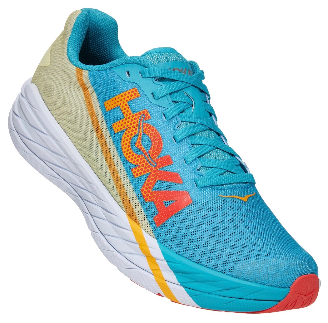 ホカ オネオネがこれまでに発売したシリーズのなかでもっともエネルギッシュなシューズのひとつであるROCKET Xは、エリートアスリート向けの軽量で非常に反応と反発性が良いレース向けシューズ。ROCKET Xの反発性の高いカーボンファイバープレートを使用し、素早く効率的で推進力のある走りを実現。レース用に設計された”スピードダガー(突き刺すようにスピードを出すもの)”の、HOKA史上最軽量のフォーム、ソフトなミッドソールキャリア、通気性の良いメッシュアッパー、フォームアウトソールに軽量なラバーフォームを採用し、シューズ全体の軽量化を実現している。