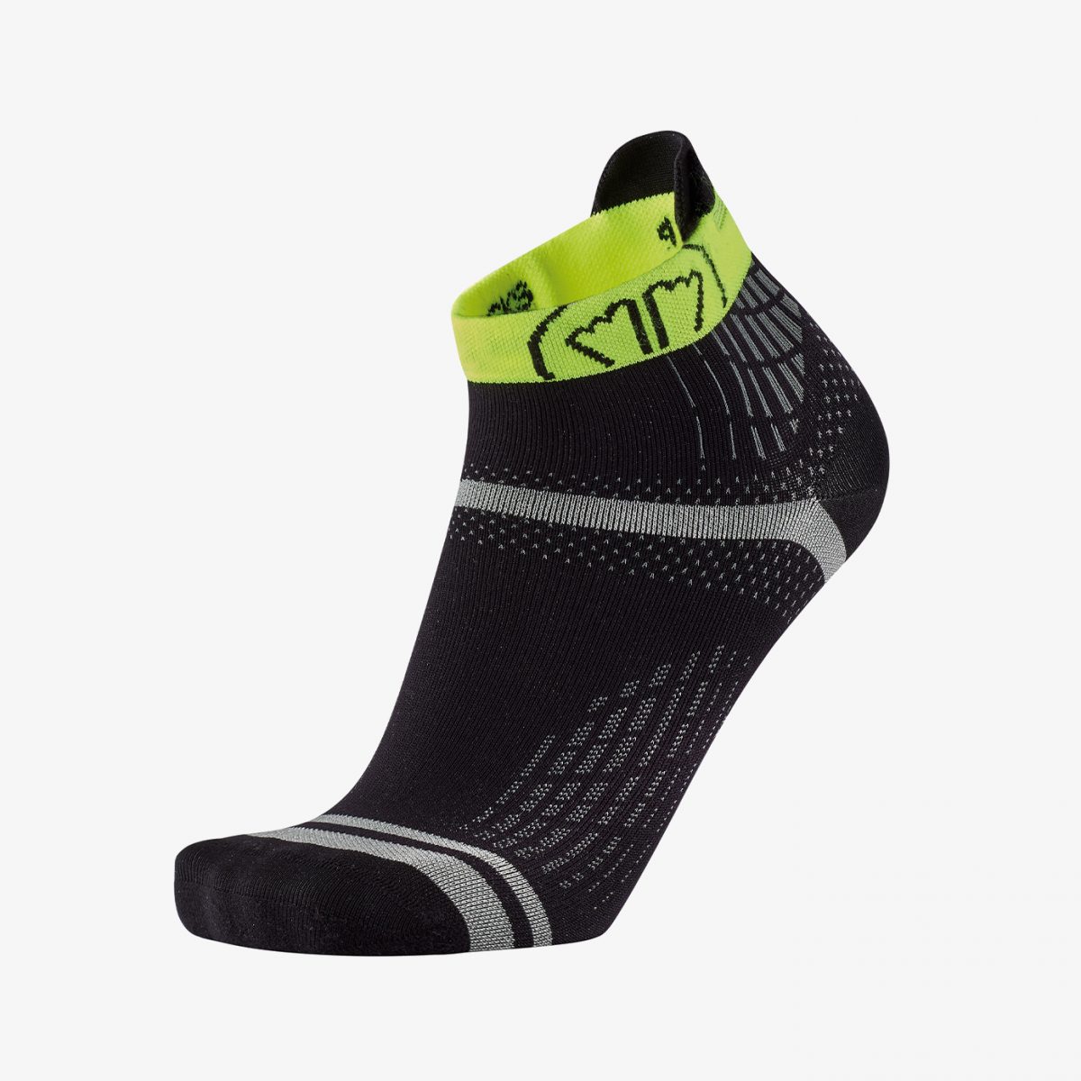 足首・くるぶし・つま先にクッション性をもたせ、負担を軽減。インソールにしっかりと接地する幅のあるグリップバンドを1本搭載することで高い安定性を与えてくれる。土踏まず部分には通気性を高めたメッシュ構造を施すことで、湿度を逃がしてくれる。繊維に抗菌・防臭加工技術「ポリジン」を使用し、長時間のレースでも快適性をキープ。足の構造と動きを考慮した左右非対称設計で高いフィット感を提供する。ナイトランに安心のリフレクター付き。