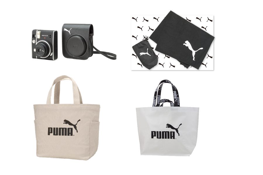 賞品はすべてPUMAオリジナル。賞品ラインナップは、インスタントカメラ “チェキ” mini40、ピクニックブランケット&シート、ビッグショッパー、スモールキャンバストートの4種類。お得なキャンペーンをお見逃しなく!