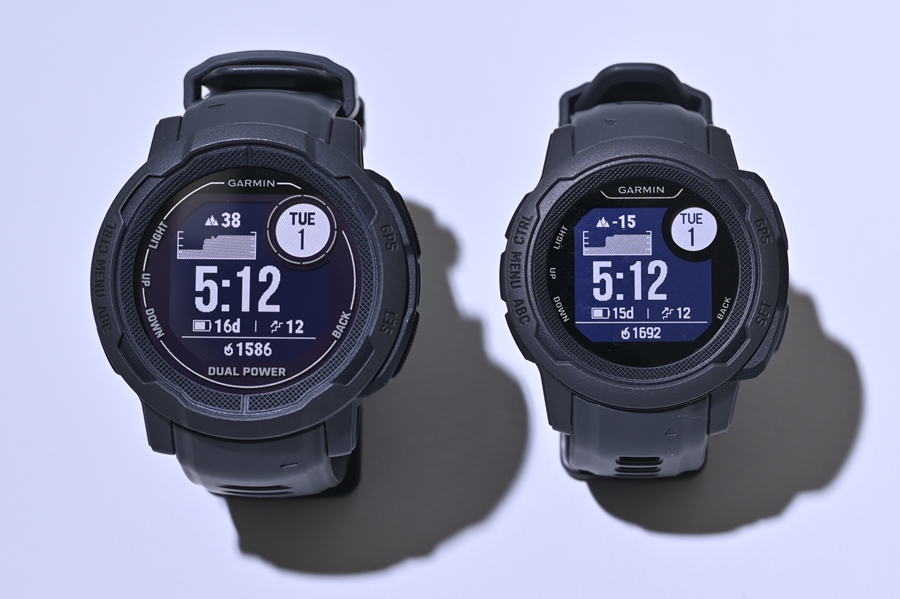 Instinct 2は、豊富なボディカラー展開が特徴だった初代Instinctから、さらにラインナップを拡充。既存の45mmサイズ(写真左)に加えて、小柄や腕が細い女性向けに40mmのコンパクトサイズのInstinct 2S(写真右)を追加した。