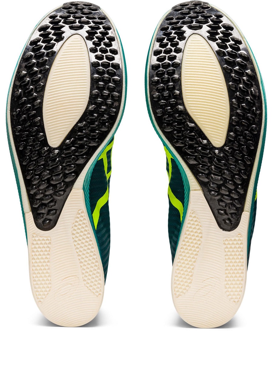 このMETASPEED LDは、“より少ない力でストライドを伸ばす”ことをコンセプトとした、5000m、10000m向けの長距離トラック競技用シューズ。特徴は、靴底に当社独自の複雑な立体形状の突起をつけた「ピンレスカーボン ヘキサクロウ」。スパイクピンがトラックに刺さる・抜ける時間、スパイクシューズとトラックの接地時間を短縮し、一歩ごとのエネルギーロスを減らすことで推進力を高める設計が施されている。