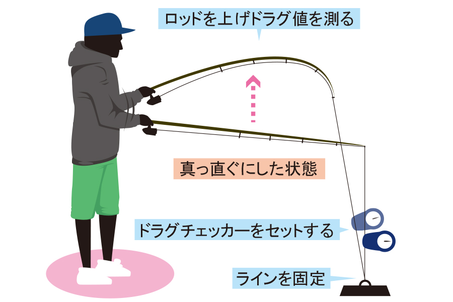 ロッドをまっすぐの状態で測ったのでは、ガイドによる摩擦が起きないため、ファイト時を想定した適正な数値を出すことができない。キャスティングゲームでのドラグ設定では、そのファイトの体勢からロッドを立てて計測することもあるが、ジギングの場合は、右のイラストのようにラインは下側、または斜め前方がベストとなる。
