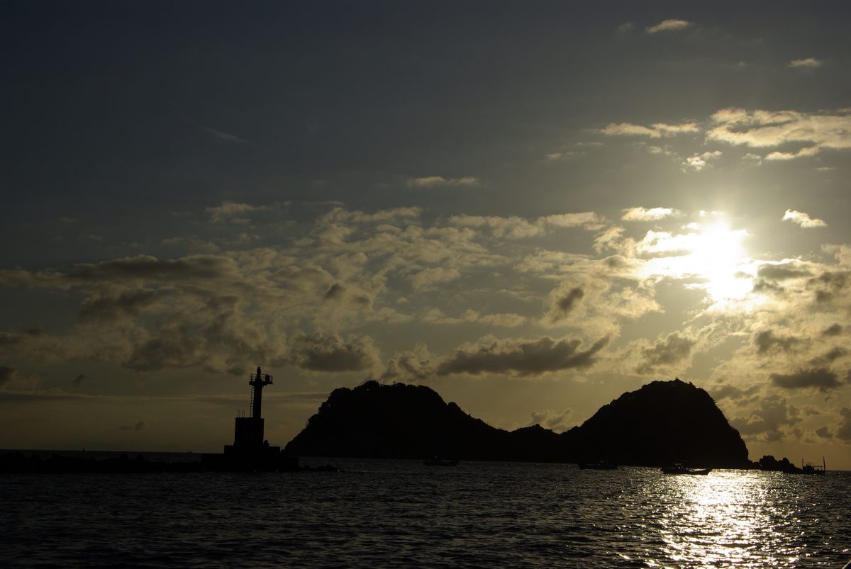 徳島県阿南市の伊島で取材した際は、ポイントに向かう途中でパチリ。朝日を背に島影がくっきりと浮かび上がっていました。