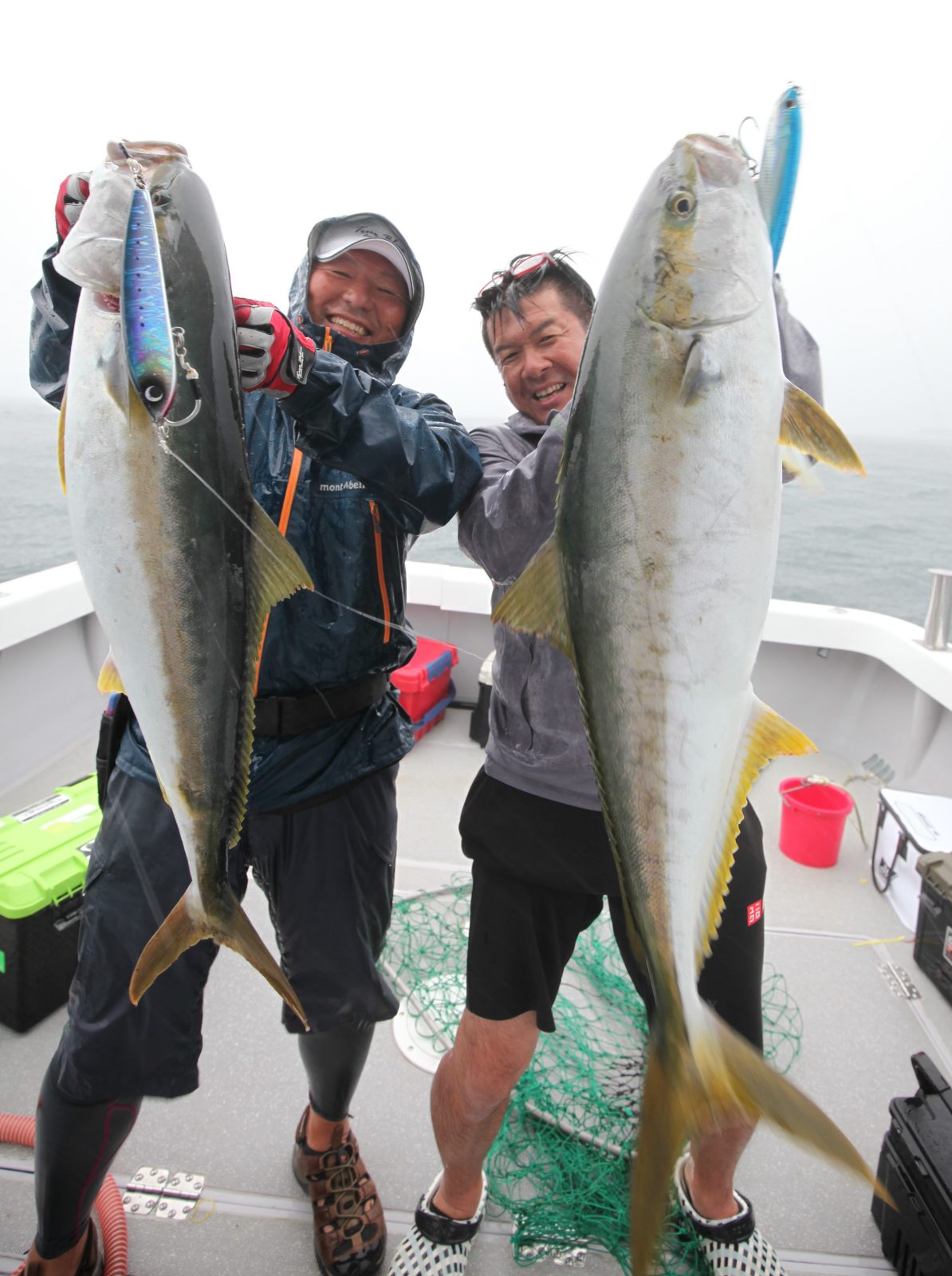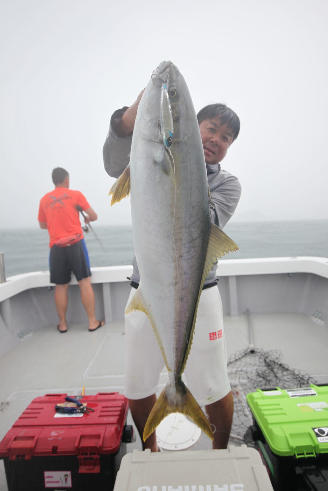 二日目、男女群島から戻って最初のポイントでドシャ降りのなか、フラップベイト22cmで、西尾さんはTWZ200FでWキャッチ。
